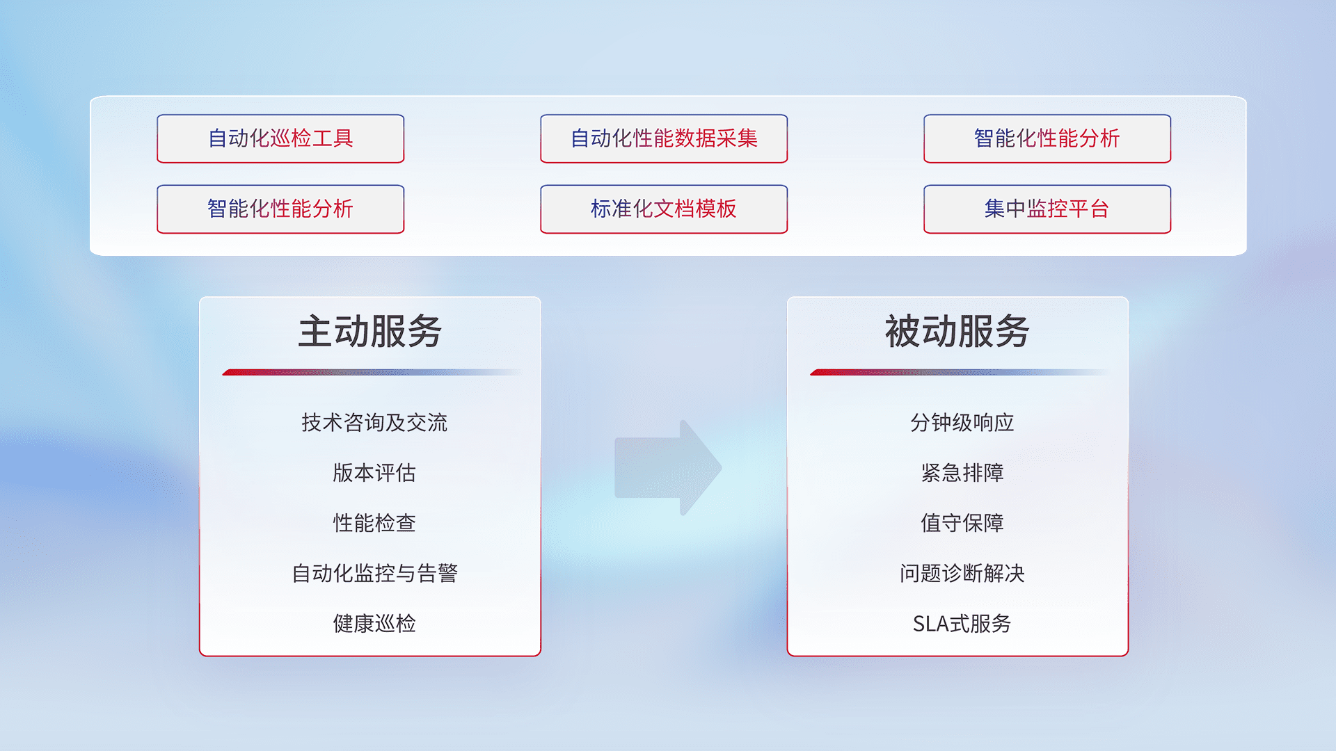 智能化工具和标准化文档,,保障服务质量,,提供主动服务(包含技术咨询、、、、版本评估、、性能检查、、、自动化监控与告警、、、、健康巡检)和被动服务包含(分钟级响应、、紧急排障、、、、值守保障、、、、问题诊断解决、、SLA服务)。。。